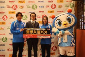 横浜FCより遠藤貴成選手、ニッパツ横浜FCシーガルズより田村かのん選手、そしてフリ丸をお招きし、弊社代表取締役の森山より選手入浴パスを贈呈いたしました。